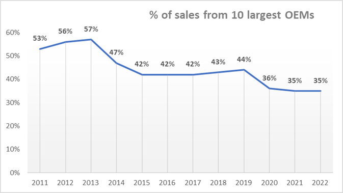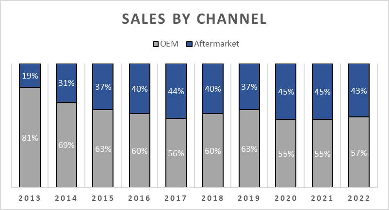 This balance is important as the aftermarket channel serves as a hedge against possible issues at the OEM level. For example, during the pandemic, various OEMs had to shut down their operations and later had troubles finishing their vehicles, leading to a decline in OEM sales. This trend can be seen in the chart above as well.
