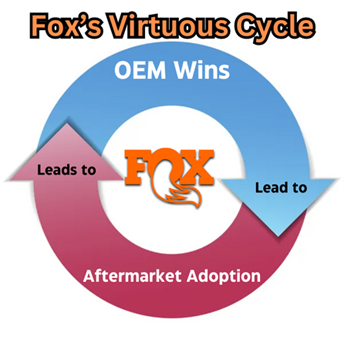 Continuing with the cycle, once people see that new Jeep models are coming with Fox shocks out of the factory, they are more likely to consider upgrading the suspension of their old Jeep model to a Fox suspension, leading to stronger aftermarket sales. This can then get Fox into talks with Jeep to further spec models with its products from the factory.
