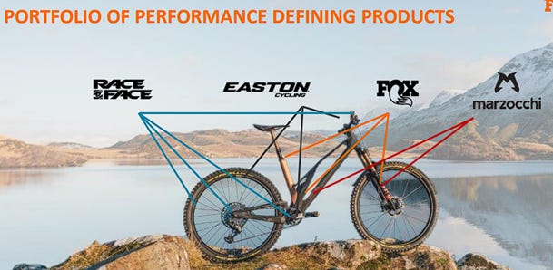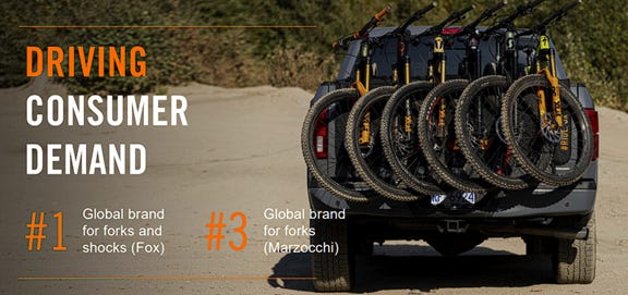 Under the Fox and Marzocchi brands, the company mostly sells bike forks, rear shocks and dropper posts, being the #1 and #3 global brands for such products respectively.