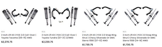 Fox also offers lift kits and components under the BDS suspension (premium), Zone Offroad (entry-level) and JKS manufacturing (Jeep specific) brands with its shock products and aftermarket accessory packages for use in trucks.