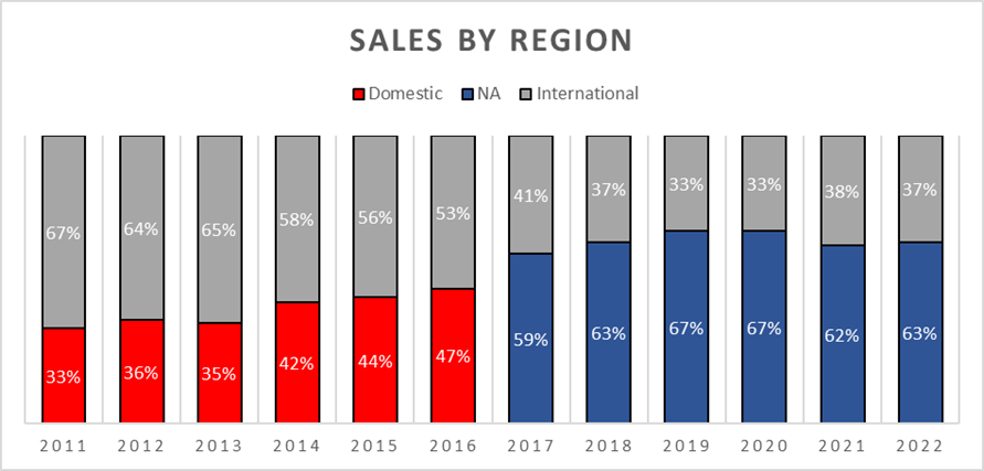 Most of Fox’s sales, especially in the PVG segment, come from NA. The SSG business has a considerable presence in Europe (35% of SSG sales back in 2015), but Fox’s overall sales are very limited outside of these two regions (For example, sales in China account for less than 1% of Fox’s revenue), giving it tremendous room for growth in the future as it begins to expands internationally.