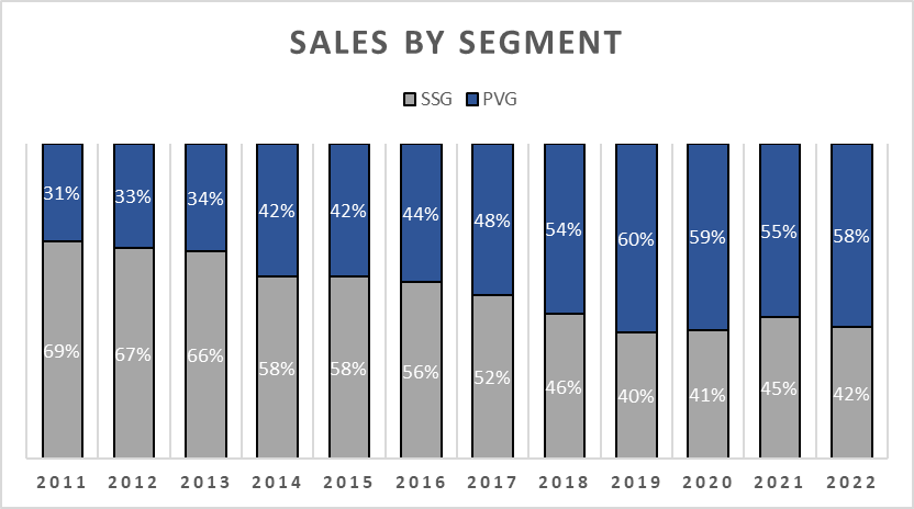 Although Fox began as a motocross suspension business, most of its initial growth in the early 2000s came from the bicycle market, eventually becoming its most relevant product line. However, ever since their first OEM deal with Ford for the 2009 Raptor, PVG has grown to eventually outsize SSG as you can see in the chart below.