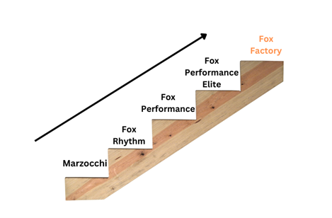 Through these offerings, Fox has created a 5-step stairway for aspirational riders to climb over time, with the offered performance increasing along with the price tag across every step.